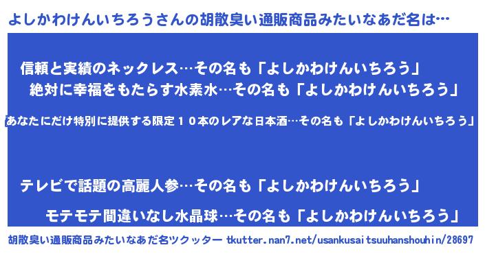 | 男性向けラノベタイトル風あだ名 | 『この素晴らしい世界によしかわけんいちろうを!』 |