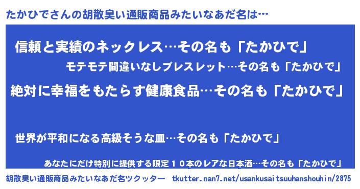 | 男性向けラノベタイトル風あだ名 | 『たかひでという概念が存在しない退屈な世界 』 |