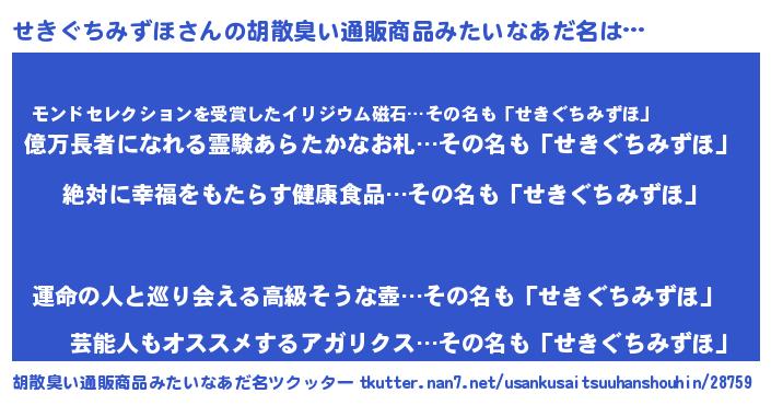 | 男性向けラノベタイトル風あだ名 | 『せきぐちみずほという概念が存在しない退屈な世界 』 |