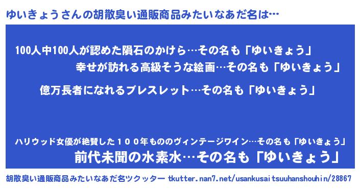 | 男性向けラノベタイトル風あだ名 | 『ゆいきょう~年齢イコール彼女いない歴の魔法使い~』 |