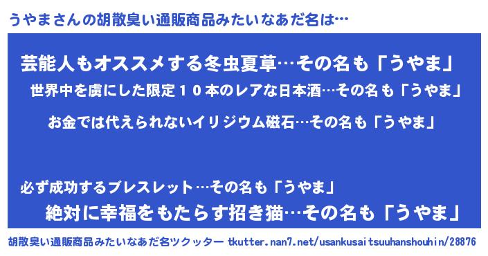 | ヘコむあだ名 | 『うやま(笑)』『うやっふぃ~』 |