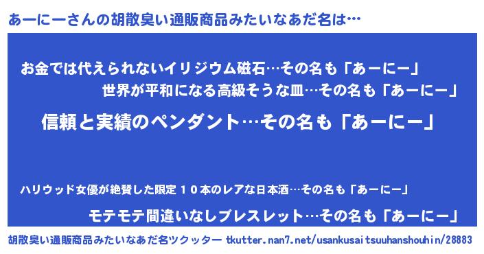 | 意味不明あだ名 | 『とにかく怪しいあーにー』 |