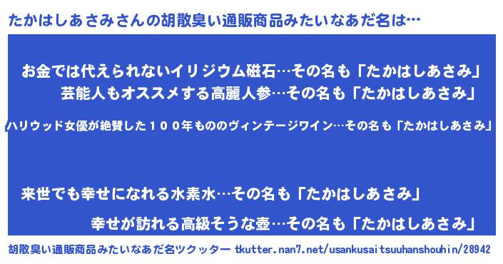 | 意味不明あだ名 | 『住所不定無職たかはしあさみ(9歳)』 |