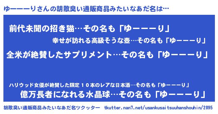 | 男性向けラノベタイトル風あだ名 | 『ゆーーーり~年齢イコール彼女いない歴の魔法使い~』 |
