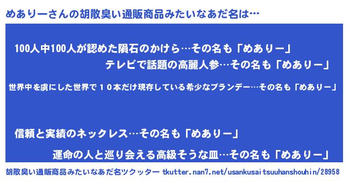| 意味不明あだ名 | 『住所不定無職めありー(85歳)』 |