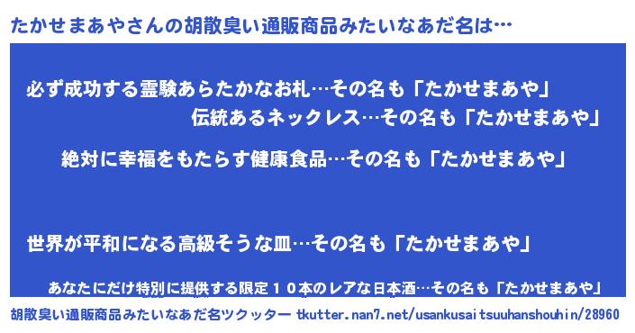 | ヘコむあだ名 | 『たかせまあや(苦笑)』『たかもー』 |