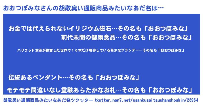 | 意味不明あだ名 | 『住所不定無職おおつぼみな(84歳)』 |