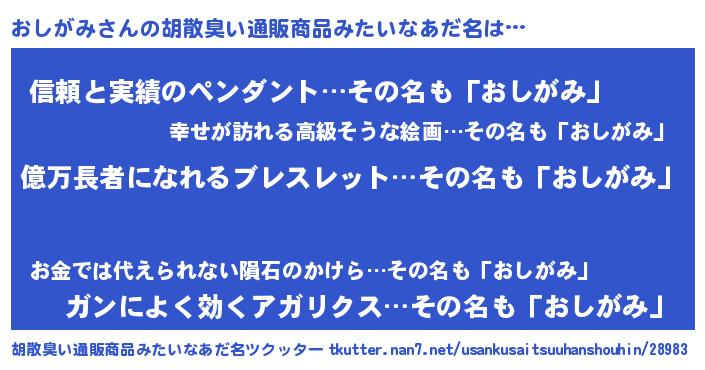 | 欧米人風あだ名 | 『マイケルおしがみ』『ウサインおしがみ』 |