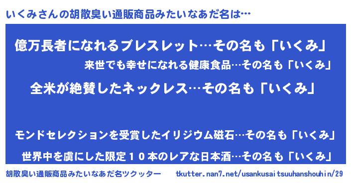 | ヘコむあだ名 | 『いくっ子』『いくもー』『なまこ酢』 |