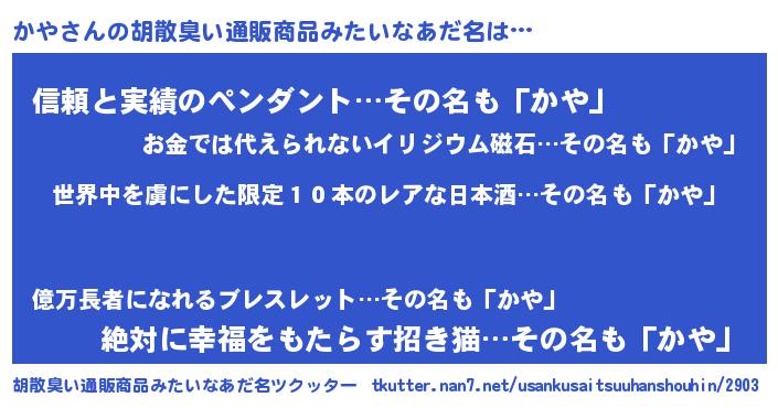 | 意味不明あだ名 | 『住所不定無職かや(65歳)』『永久保存かや』 |
