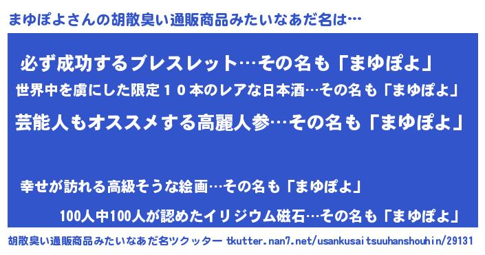 | 男性向けラノベタイトル風あだ名 | 『Re:まゆぽよから始める異世界生活』 |