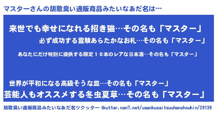 | 男性向けラノベタイトル風あだ名 | 『この素晴らしい世界にマスターを!』 |