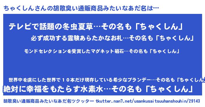 | ヘコむあだ名 | 『ちゃくしん(笑)』『ちゃもー』 |