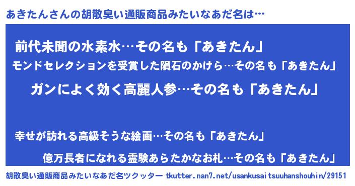| ヘコむあだ名 | 『あきたん(小並感)』『あきもー』 |