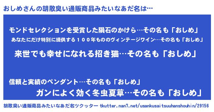| ヘコむあだ名 | 『おしめ(小並感)』『おしぷりん』 |