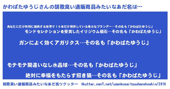 | ヘコむあだ名 | 『かわばたゆうじ(爆)』『かわもー』 |