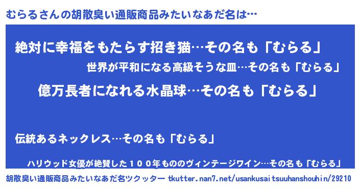 | 男性向けラノベタイトル風あだ名 | 『むらるに滅ぼされるだけの簡単なお仕事です』 |