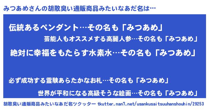 | 意味不明あだ名 | 『永久保存みつあめ』『自称みつあめ』 |