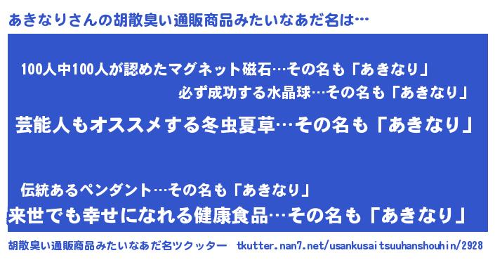 | 意味不明あだ名 | 『自称あきなり』『しいたけ科あきなり属』 |