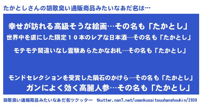 | ヘコむあだ名 | 『たかもー』『つくし』『たか太郎』 |