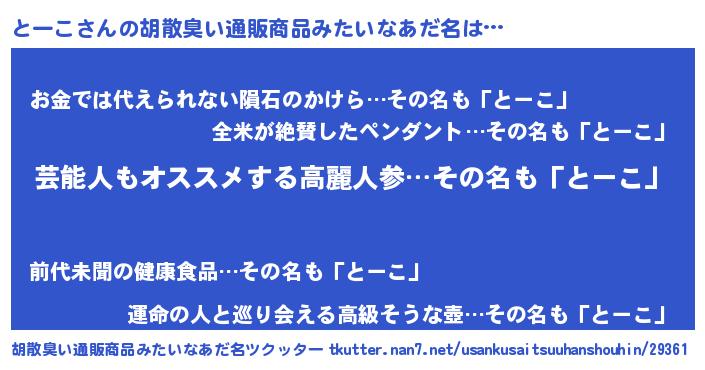 | 意味不明あだ名 | 『自称とーこ』『エリンギ科とーこ属』 |