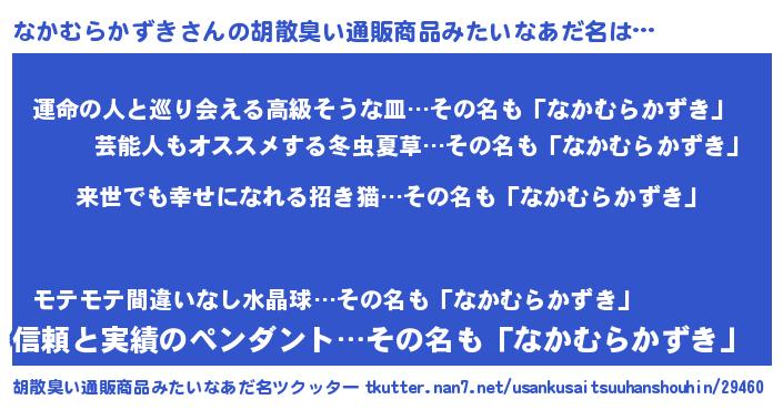 | 男性向けラノベタイトル風あだ名 | 『なかむらかずきという概念が存在しない退屈な世界 』 |