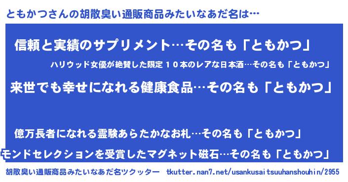 | ヘコむあだ名 | 『ともかつ(爆)』『とも太郎』『牛乳』 |