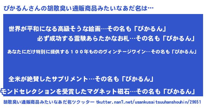 | 男性向けラノベタイトル風あだ名 | 『この素晴らしい世界にぴかるんを!』 |