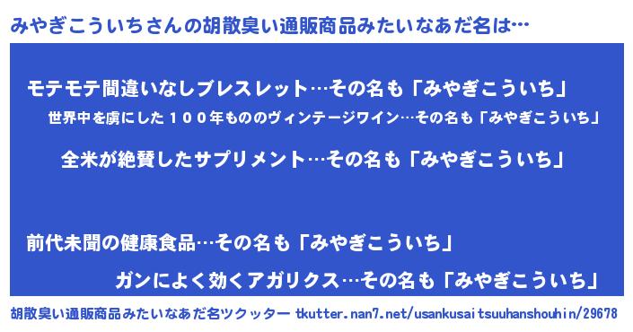 | 欧米人風あだ名 | 『ウサインみやぎこういち』 |