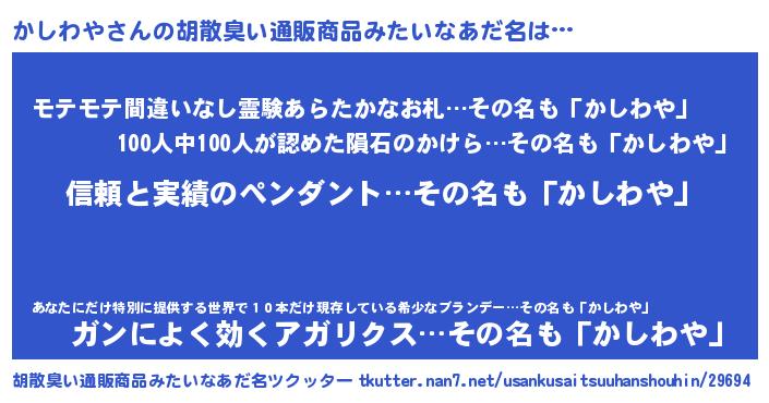 | 恥ずかしいあだ名 | 『カシリンリン』『プリティーかしわや』 |