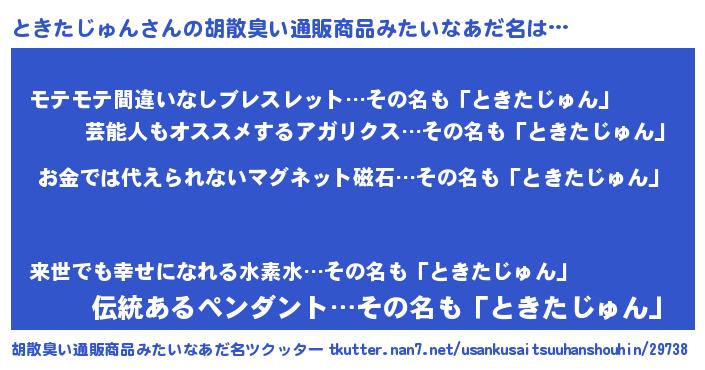 | 肩書あだ名 | 『ときたじゅん教授』『ときたじゅん社長』 |