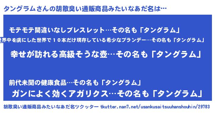 | 男性向けラノベタイトル風あだ名 | 『やはりタングラムの青春ラブコメはまちがっている 』 |