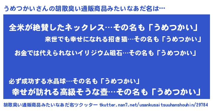 | 男性向けラノベタイトル風あだ名 | 『転生したらうめつかいだった件』 |