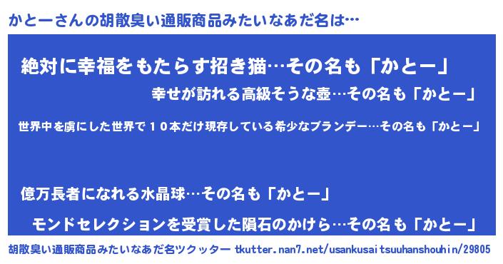 | 恥ずかしいあだ名 | 『かとちん』『ボンバーヘッドかと』 |