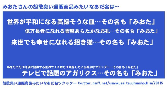 | ヘコむあだ名 | 『みおた(笑)』『なまこ酢』 |
