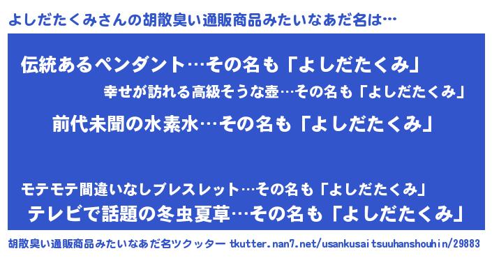 | 意味不明あだ名 | 『永久保存よしだたくみ』 |