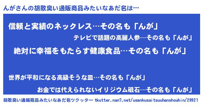 | 男性向けラノベタイトル風あだ名 | 『んがという概念が存在しない退屈な世界 』 |