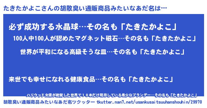 | ヘコむあだ名 | 『なまこ酢』『たきにゅー』『たきお』 |