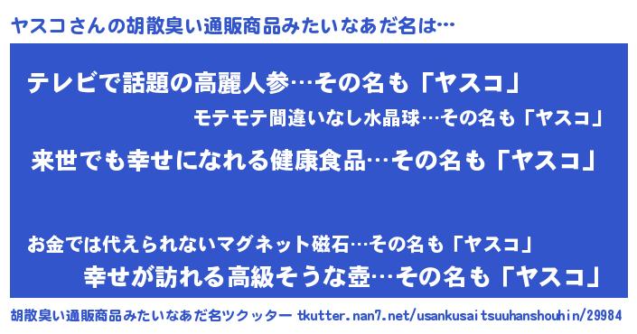 | 男性向けラノベタイトル風あだ名 | 『転生したらヤスコだった件』 |