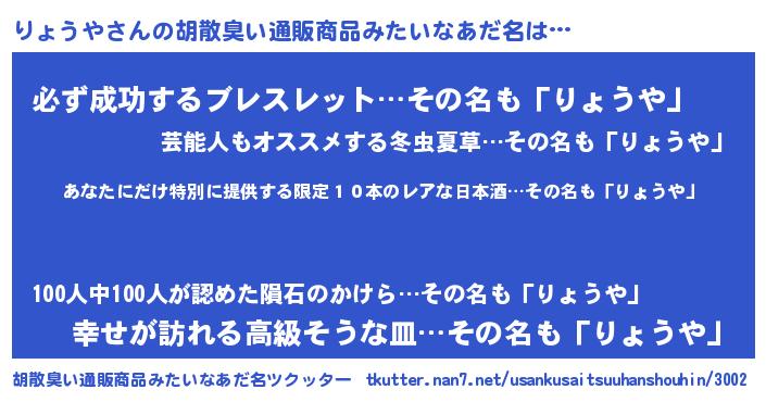 | 意味不明あだ名 | 『住所不定無職りょうや(53歳)』 |