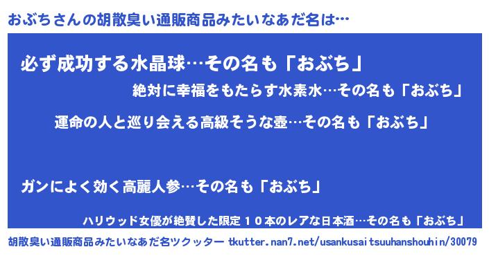 | 男性向けラノベタイトル風あだ名 | 『うちのおぶちが世界を掌握している!』 |