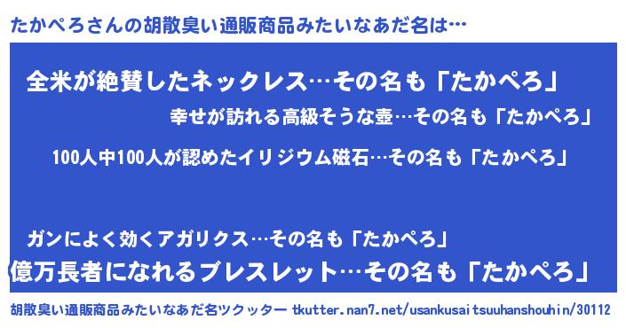 | 男性向けラノベタイトル風あだ名 | 『おまえをオタクにしてやるから、俺をたかぺろにしてくれ! 』 |
