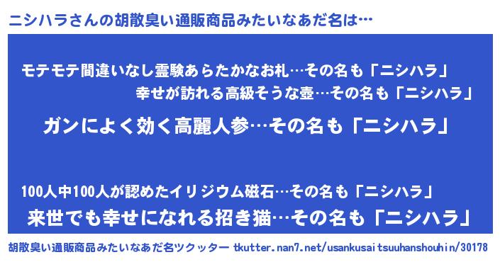 | 男性向けラノベタイトル風あだ名 | 『ニシハラスレイヤー』『ニシハラの憂鬱』 |