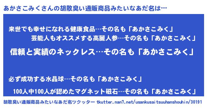あかさこみくさんの胡散臭い通販商品みたいなあだ名をツクッター!