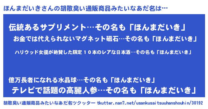 | 意味不明あだ名 | 『住所不定無職ほんまだいき(59歳)』 |