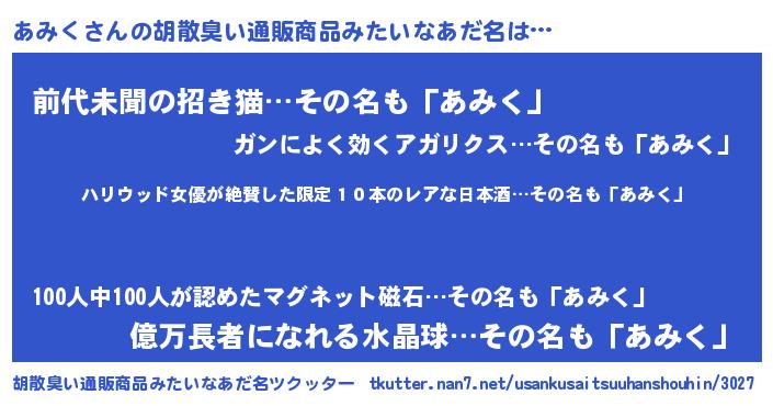 | 意味不明あだ名 | 『住所不定無職あみく(39歳)』『自称あみく』 |