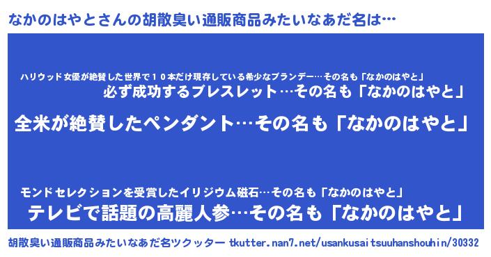| 男性向けラノベタイトル風あだ名 | 『なかのはやとの嫁は女の子じゃないと思った?』 |