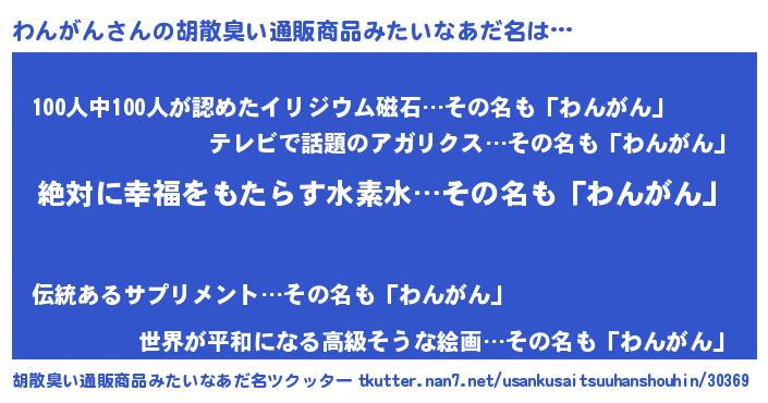 | 男性向けラノベタイトル風あだ名 | 『わんがんという概念が存在しない退屈な世界 』 |