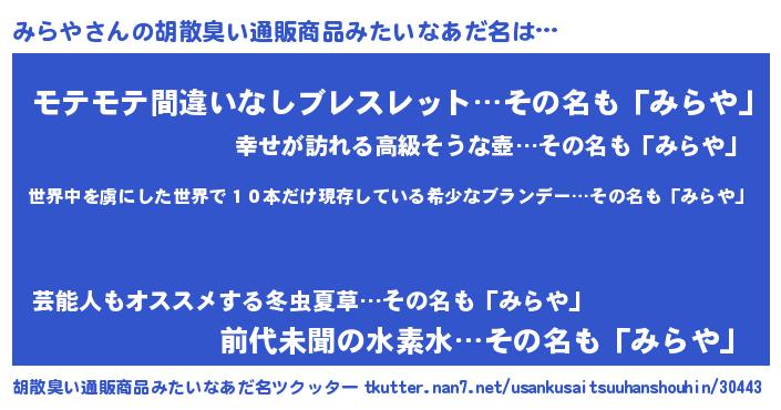 | ヘコむあだ名 | 『みらもー』『みらや(小並感)』 |