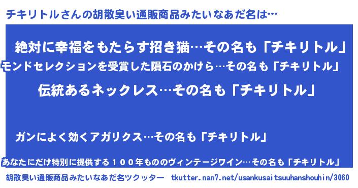 | 意味不明あだ名 | 『とにかく怪しいチキリトル』 |